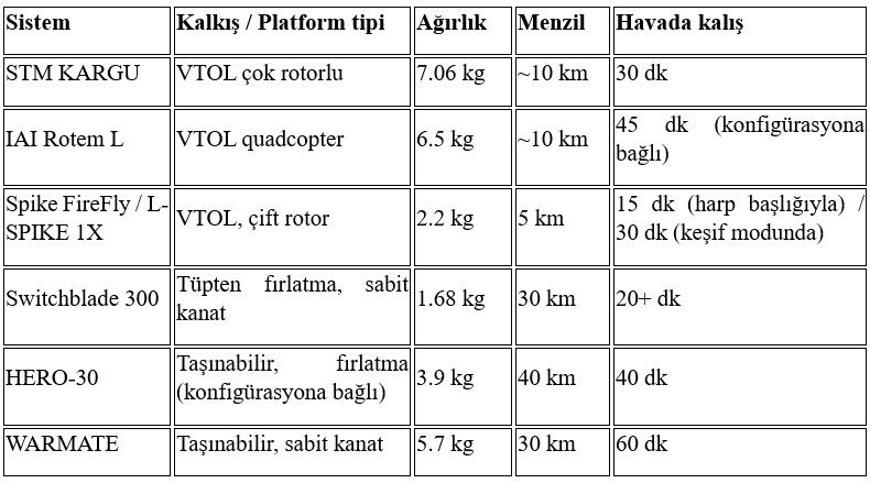 Benzer görev ailesinde konumlanan HERO-30 ve WARMATE gibi sistemler; ağırlıklı olarak menzil ve havada kalış süresi parametreleri üzerinden öne çıkan, çoğunlukla tekil platform kullanımına dayalı taktik çözümler sunmaktadır. Bu platformlar, nokta hedeflere yönelik belirli senaryolarda etkinlik sağlasa da mimarileri gereği kolektif görev icrası ve çoklu platform koordinasyonu sınırlı kalmaktadır. Buna karşılık, STM tarafından geliştirilen KARGU’nun 20’li sürü konfigürasyonu ile canlı mühimmatlı testten başarıyla geçmiş olması, değerlendirme eksenini yalnızca uçuş performansı ya da menzil gibi teknik metriklerden çıkararak, algoritma–haberleşme–komuta–angajman zincirinin sistem seviyesinde olgunluğuna taşımaktadır. Bu yönüyle KARGU, tekil platform performansına dayalı çözümlerden ayrışarak sahada doğrulanmış sürü davranışı, görev paylaşımı ve eş zamanlı kinetik etki üretimiyle daha üst düzey bir operasyonel yetkinlik katmanını temsil etmektedir.