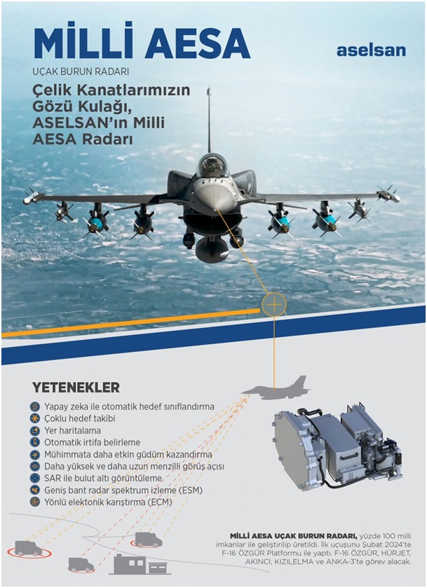 Bu stratejik bağlamda Türkiye, kendi ulusal çözümünü geliştirerek yerli ve milli savunma sanayii hedefleri doğrultusunda önemli bir ilerleme kaydetmiştir. Bu çabanın bir ürünü olan MURAD Aktif Elektronik Taramalı Dizi (AESA) radarı, Türk Hava Kuvvetleri için kritik bir sensör kabiliyeti olarak konumlandırılmıştır. Muharip hava platformlarının temel bileşenlerinden olan AESA radar teknolojisi, MURAD sistemi özelinde F-16, Bayraktar KIZILELMA ve Bayraktar AKINCI platformlarına başarıyla entegre edilmiş ve test süreçleri tamamlanmıştır. Bu gelişme, kritik bir teknoloji alanında dışa bağımlılığın azaltılması ve askeri güvenlik kabiliyetlerinin artırılması bakımından önemli bir eşiğin aşıldığını göstermektedir.