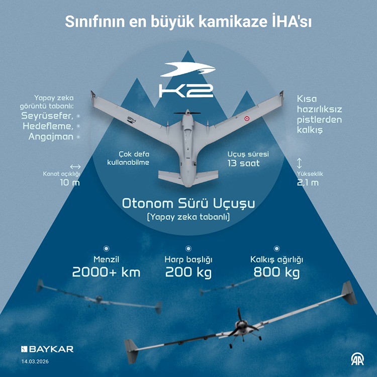 Baykar tarafından geliştirilen Bayraktar K2 Kamikaze İHA, klasik gezgin (loitering) mühimmat anlayışını bir üst seviyeye taşıyan, yüksek tahrip gücüne odaklı yeni nesil bir sistem olarak değerlendirilmektedir. Yeni nesil savaş konseptlerine uygun olarak yapay zekâ, sürü otonomisi ve yüksek operasyonel esneklik kabiliyetlerini tek platformda birleştiren stratejik bir sistem olarak öne çıkmaktadır.