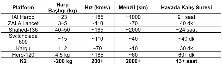 Benzer şekilde İsrail üretimi UVision Hero-120 yaklaşık 4,5 kg harp başlığı, yaklaşık 185 km/s hız, 60+ dk havada kalış süresi ve 60 km menzil ile orta sınıf bir çözüm sunar. Ancak K2 ile karşılaştırıldığında bu sistemin hem menzil hem de yıkım gücü açısından 20 kata varan farklarla geride kaldığı görülmektedir.